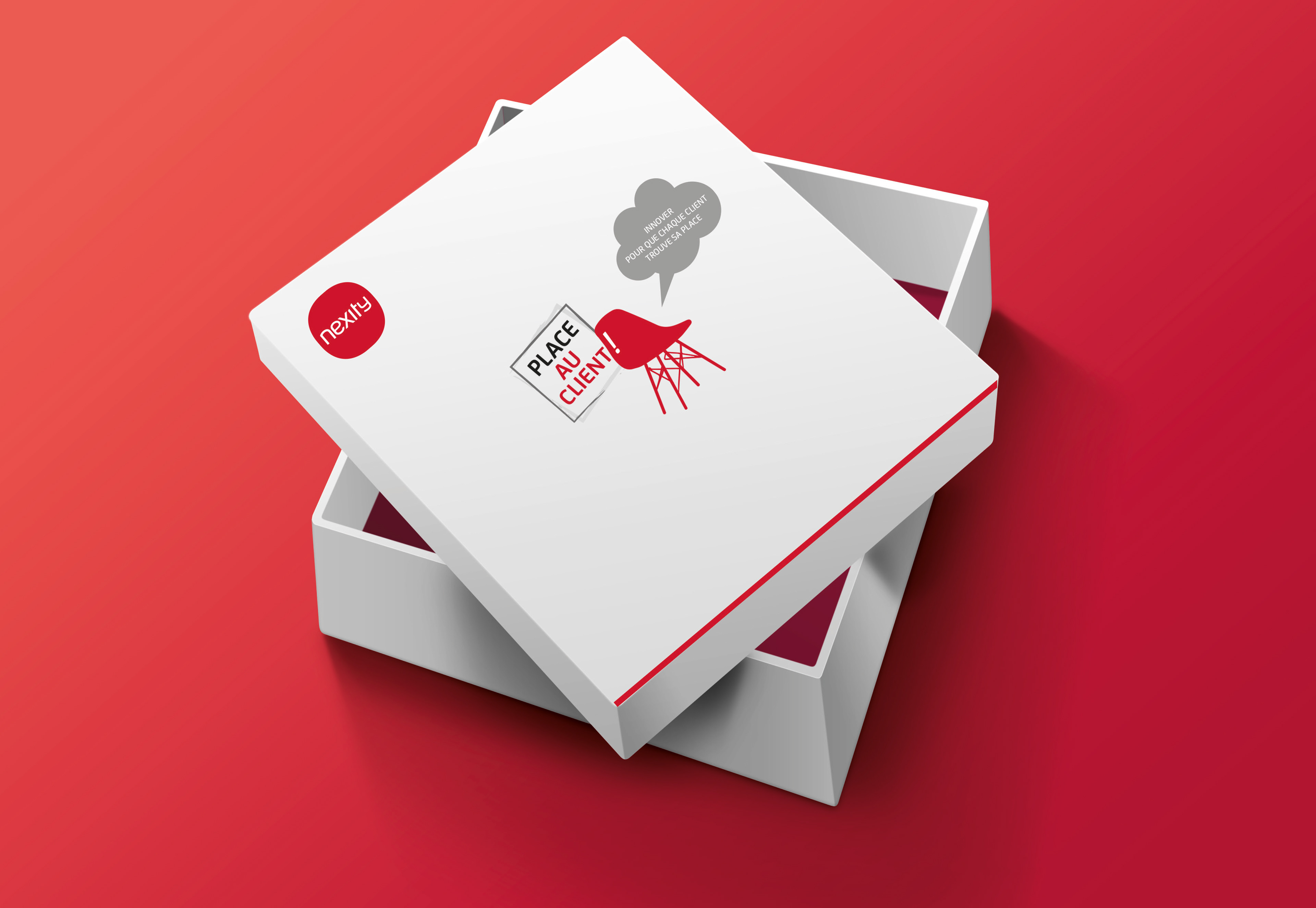 Kit "PLACE AU CLIENT !" Coffret et chaise distribué dans chaque bureau de vente Nexity. "Se mettre à la place du client" - Objectif de performance sur la force de vente du Groupe.